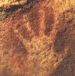 “Els artistes de la prehistòria també van inscriure signes estranys en les grutes, especialment eixes famoses mans aplicades a les parets com a enigmàtiques firmes. Aplicant en la roca la mà coberta de pintura, els nostres avantpassats obtenen el que s'anomena “mà”. També realitzen “mans” segons la tècnica de la plantilla: apliquen primer la mà sobre la paret i bufen el color al voltant; es mostra llavors el dibuix del contorn dels dits.
